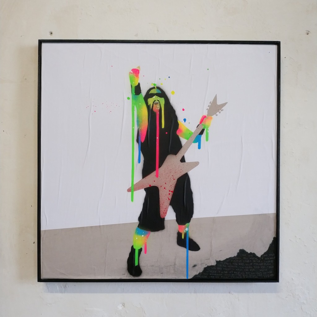 Eliot Eliot | Aus der Serie „Drei Ikonen“: Dimebag Darrel | 2018 | Papiercollage, Stencil auf Holz | 60 x 60 cm | 840 Euro