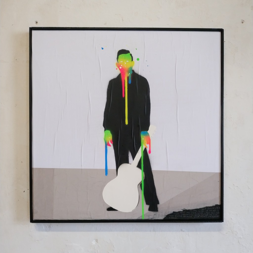 Eliot Eliot | Aus der Serie „Drei Ikonen“: Johnny Cash | 2018 Papiercollage, Stencil auf Holz | 60 x 60 cm | 840 Euro