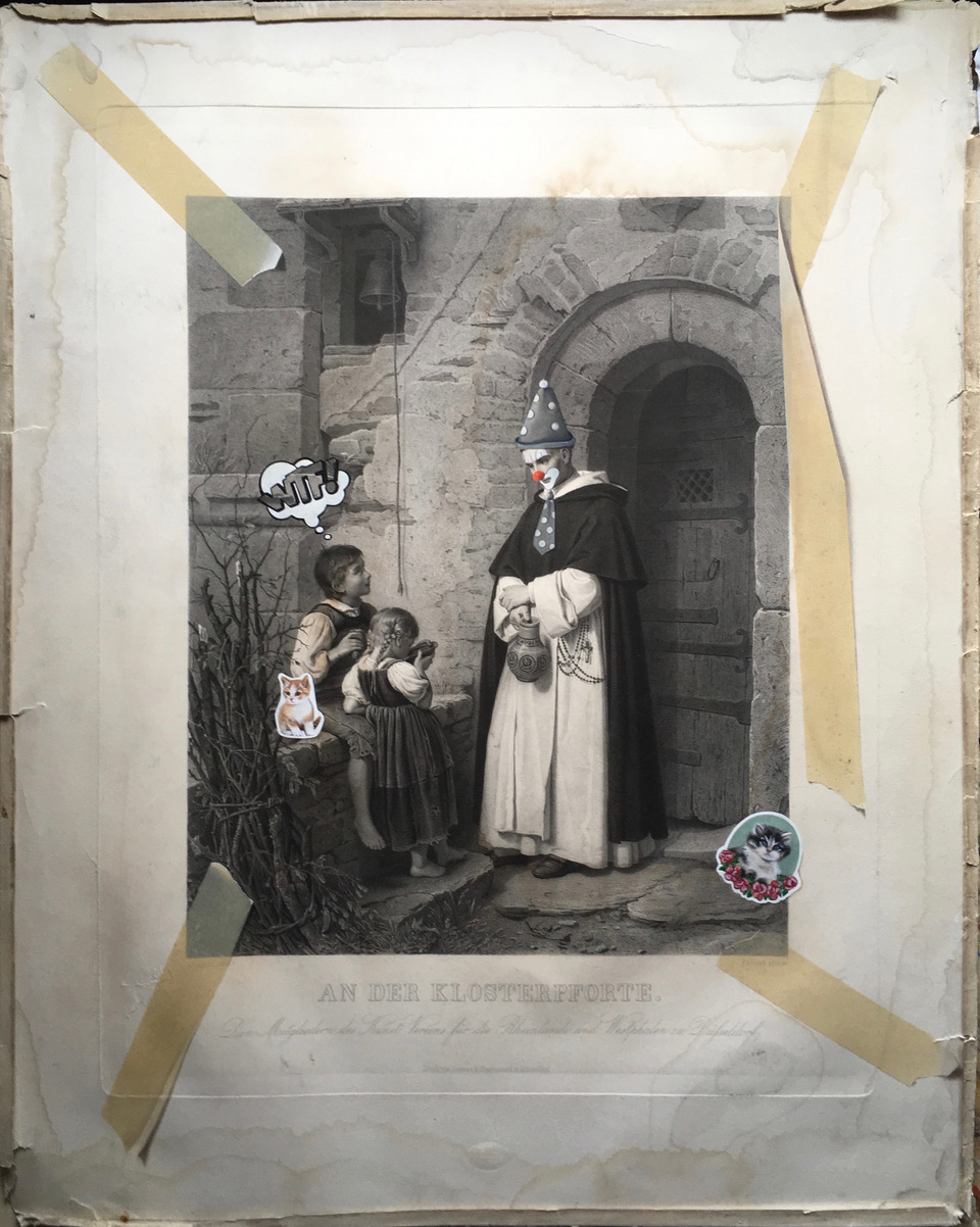 Astrid Köhler Astrid Köhler | Neulich an der Klosterpforte | 2018 | Öl und Spraylack auf altem Papier/Stahlstich | 52 x 62 cm | 1900 Euro