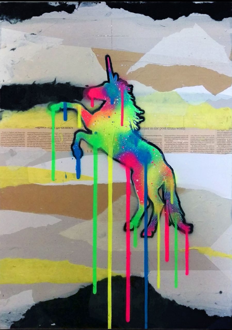 Eliot Eliot | Einhorn. In The Post-Truth World | 2017 | Collage und Spraylack auf Leinwand | 71 x 51 cm | 780 Euro