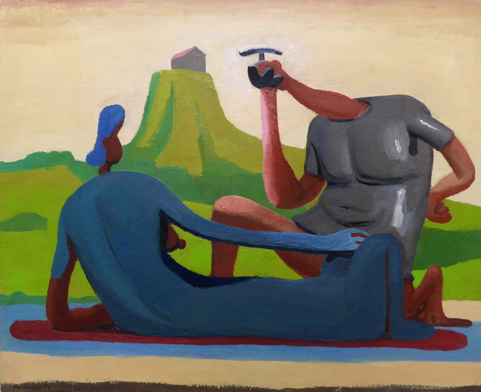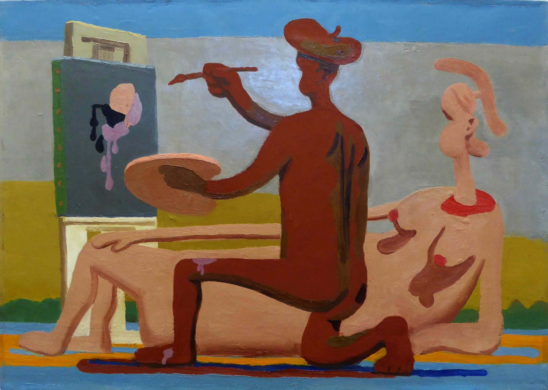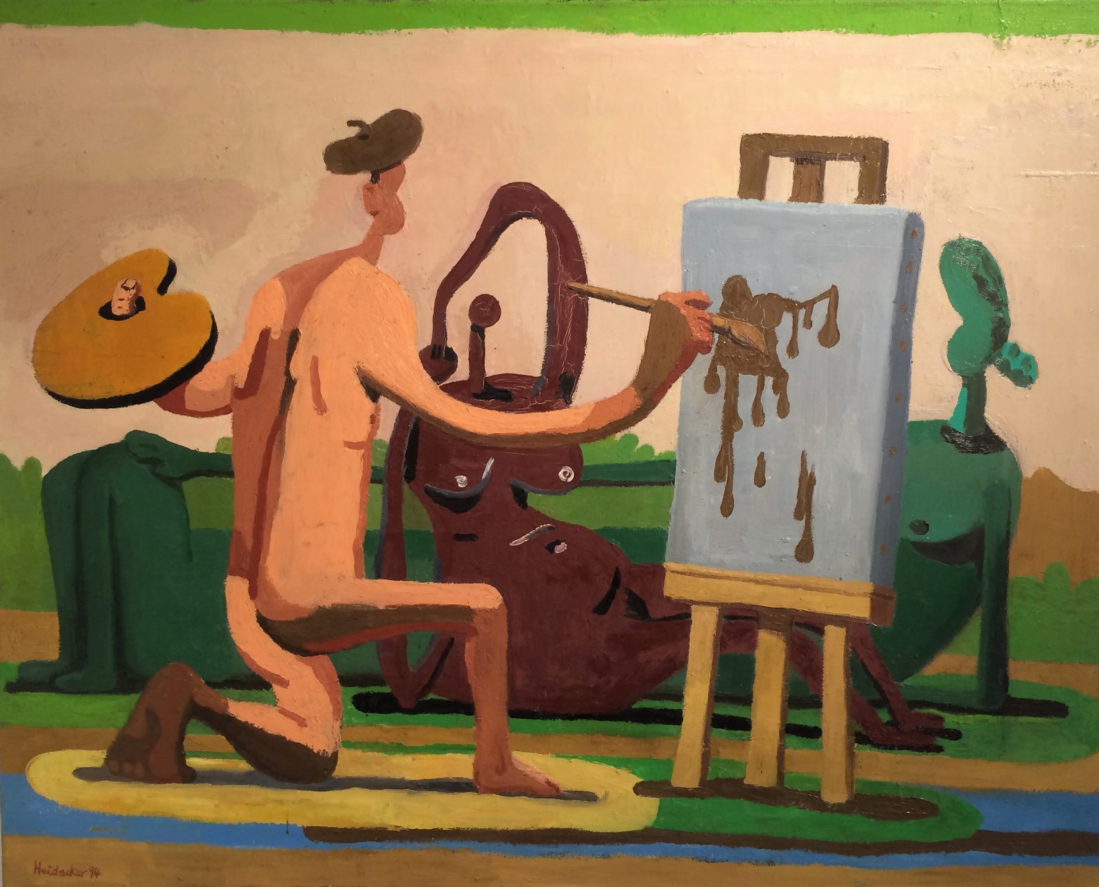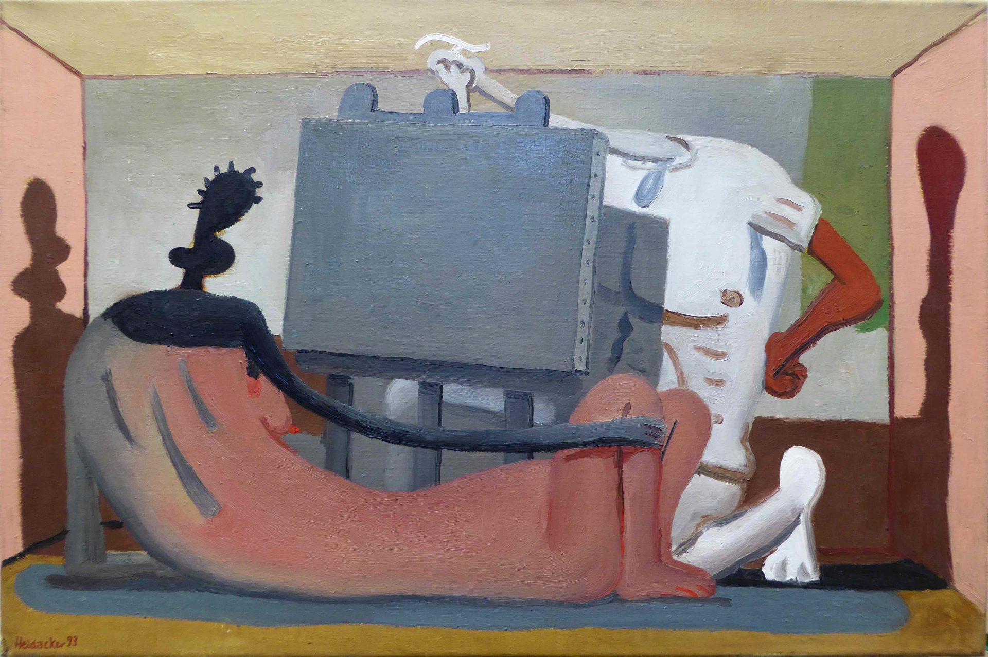 Spannend ist dabei auch die Umkehr der Dimensionen: Normalerweise lassen KünstlerInnen eine zweidimensionale Leinwand dreidimensional erscheinen. Heidacker aber schafft das Gegenteil: Eine dreidimensionale Atelierszene malt er als zweidimensionales kubistisches Bild – in einer Farbwelt, die für den klassischen Kubismus viel zu bunt ist.