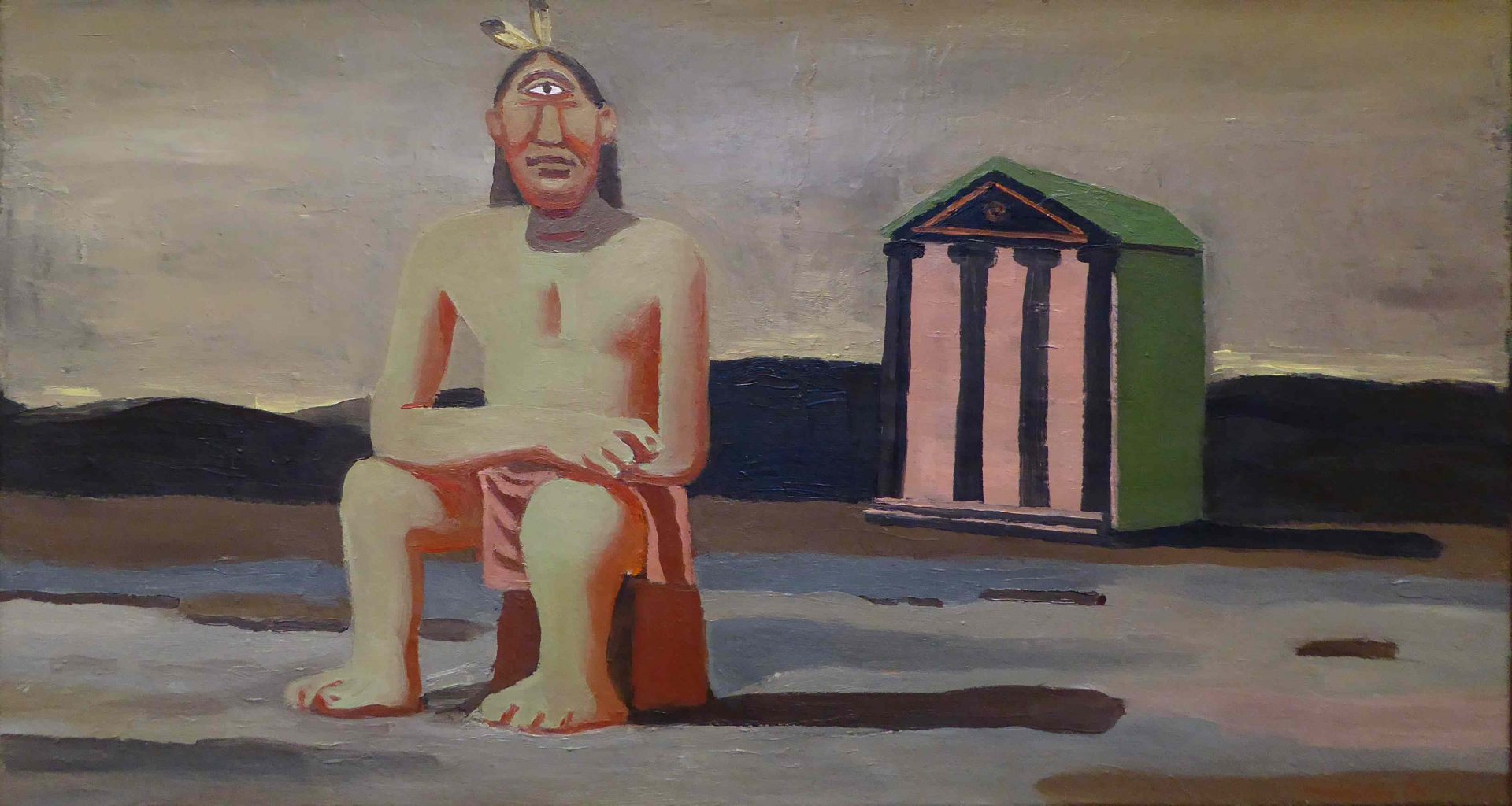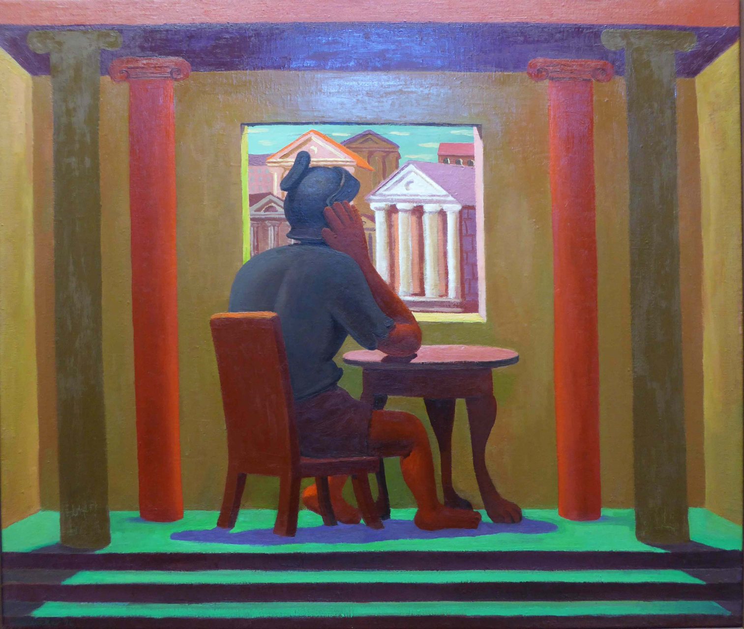 Lässt man sich aber auf sie ein, versteht man den subtilen Humor: In einer bunten Farbwelt sitzt ein Römer ganz selbstverständlich am Schreibtisch und schaut gedankenverloren aus dem Fenster auf eine Landschaft voller Säulen – eine alltägliche Handlung also, in einem atypischen Setting.