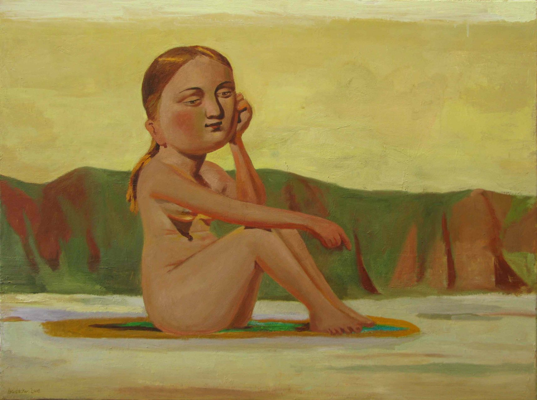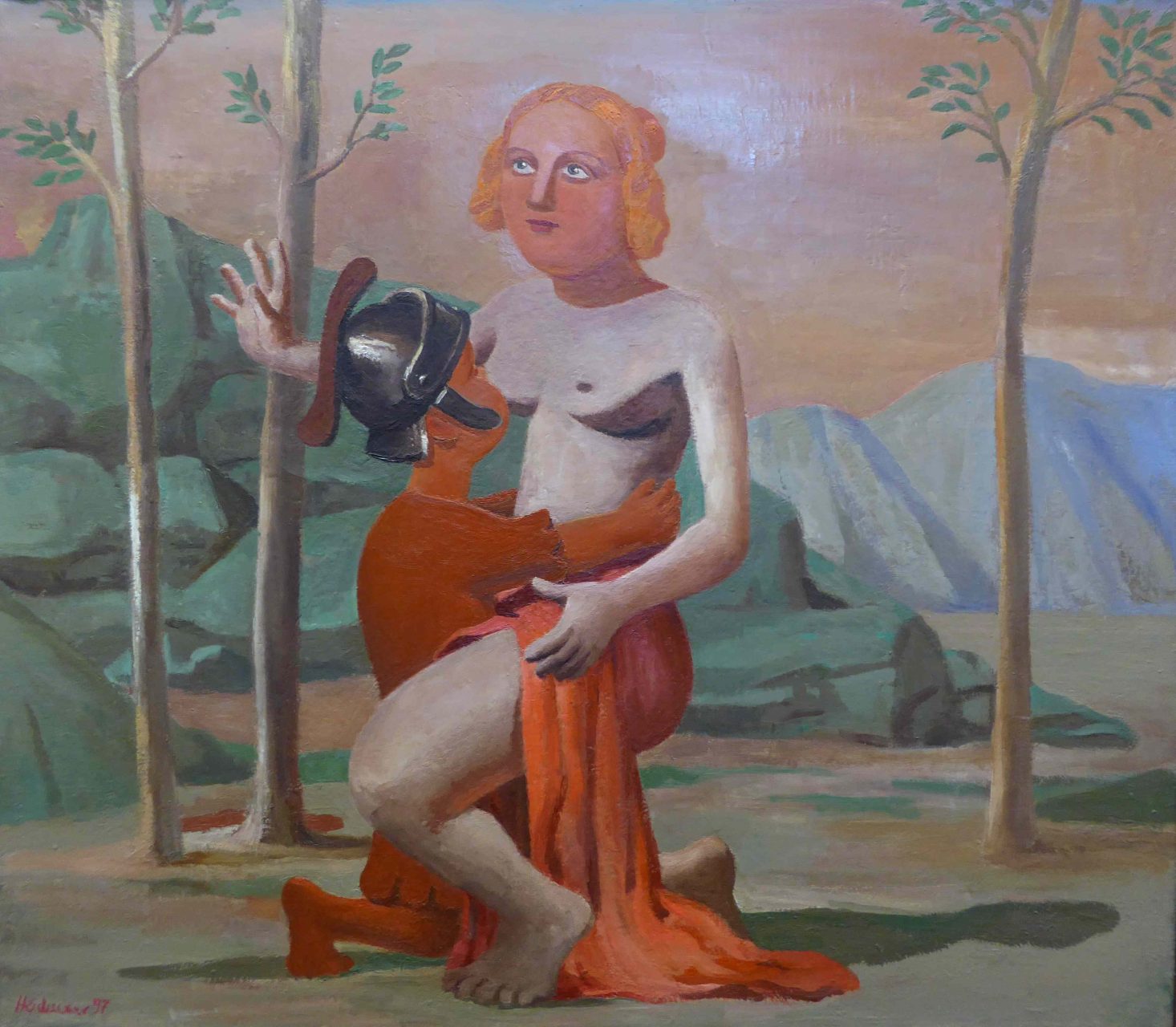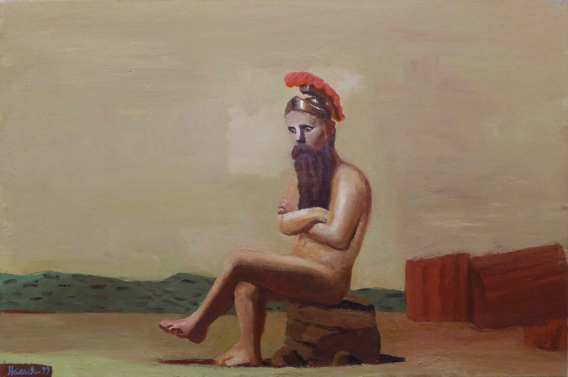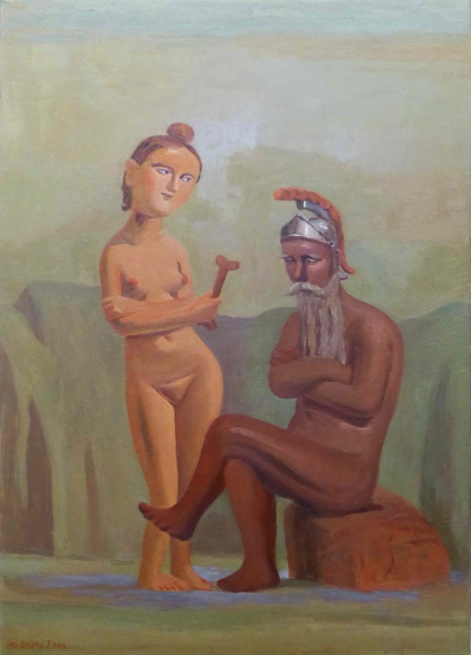 Im Hintergrund vieler seiner Arbeiten sehen wir Themen der Antike während wir im Vordergrund Figuren erkennen, die an Picasso erinnern oder Menschen sehen, die geheimnisvoll und verträumt da sitzen und in eine undefinierbare Ferne schauen. Dabei wirken Heidackers Werke auf den ersten Blick oft sehr ernst.