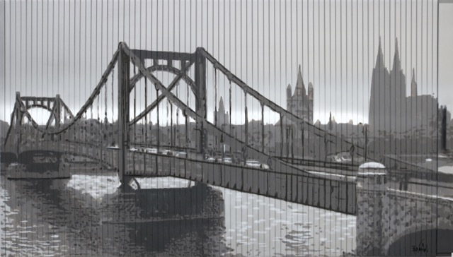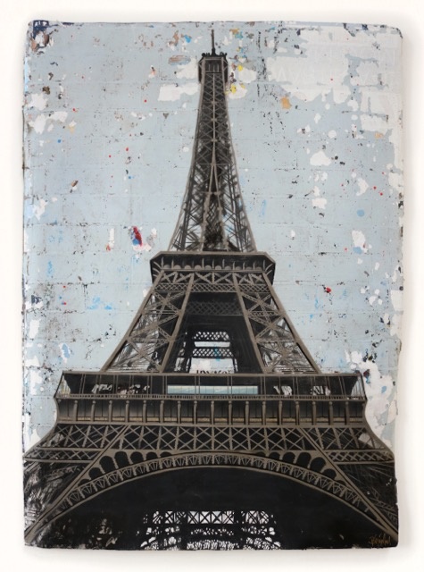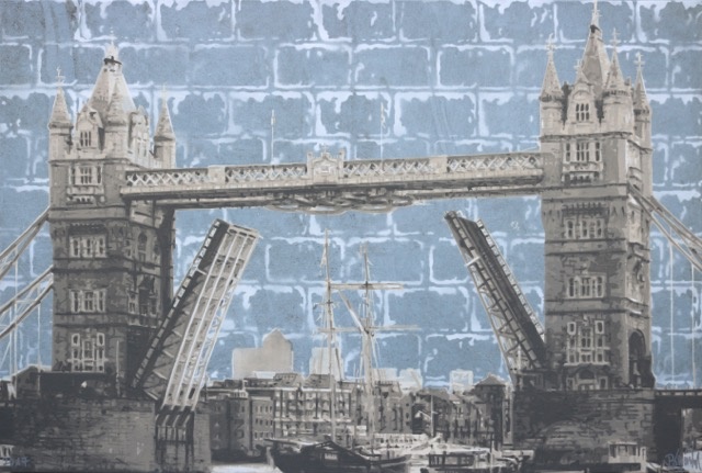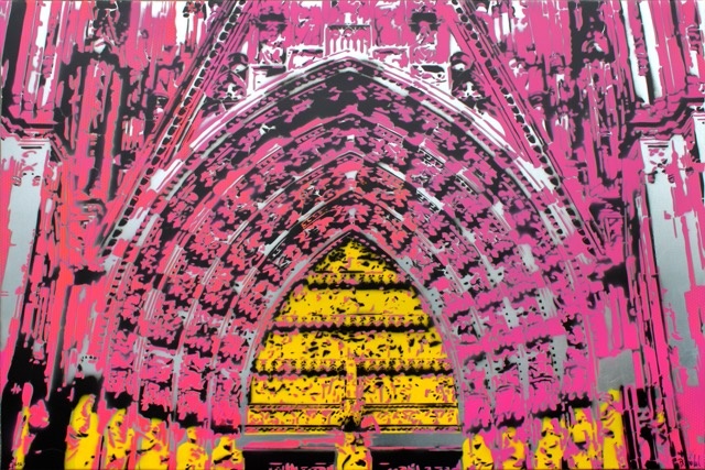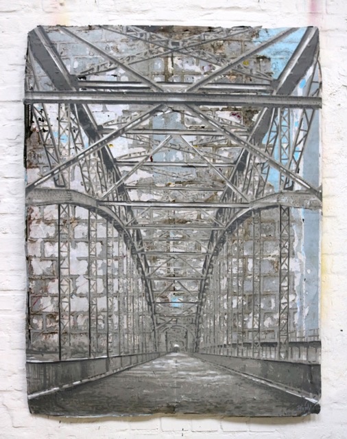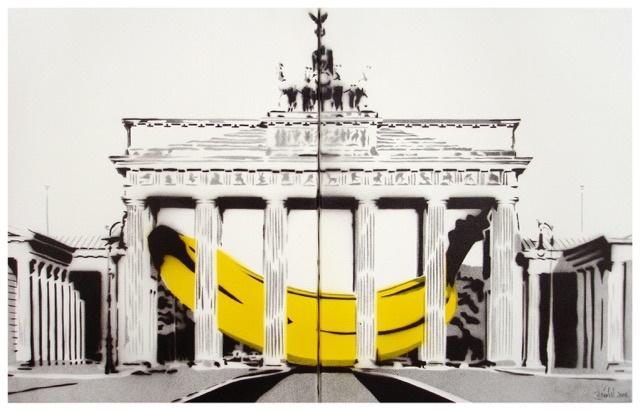 Die Arbeiten des als „Bananensprayer“ bekannten Künstlers sind zum großteil auf Plakatpapieren gestaltet, was ihnen einen unweigerlichen Streetart Charakter verleiht. Die Plakate nämlich, auf denen Baumgärtel seine ikonischen Architekturen gestaltet, sind aus dem Kölner Stadtbild entnommen. Beweis dafür sind die markanten Backsteinabdrücke, die sich auf den Plakatwänden erhalten haben und den Werken eine unvergleichlich authentische Materialität verleihen. Und auch sonst scheut sich der Künstler nicht, das zu bemalen, was die Straße ihm zur Verfügung stellt: Straßenschilder, Aluminiumplatten, Baustoffe.