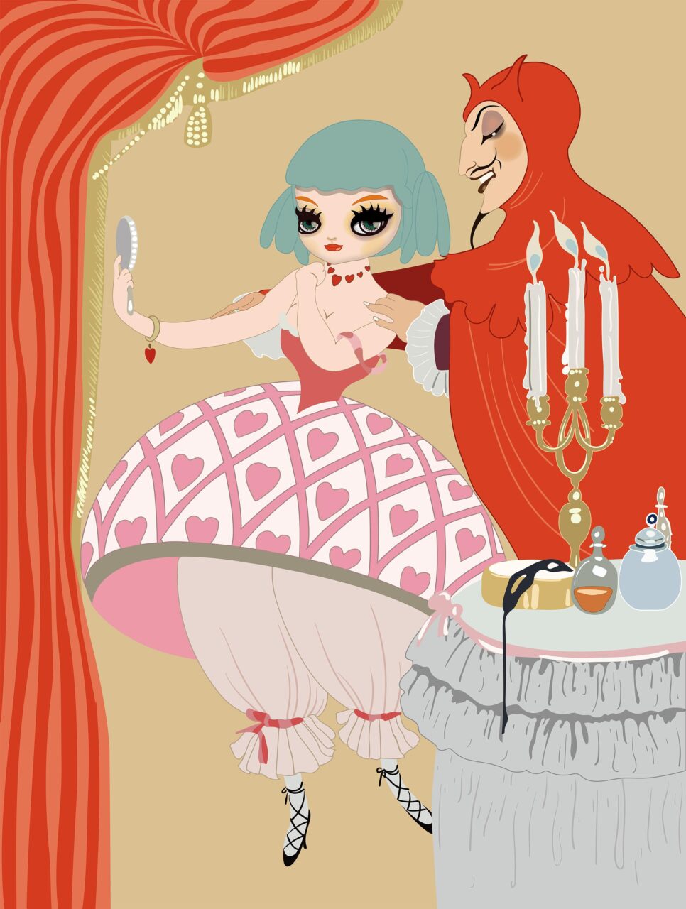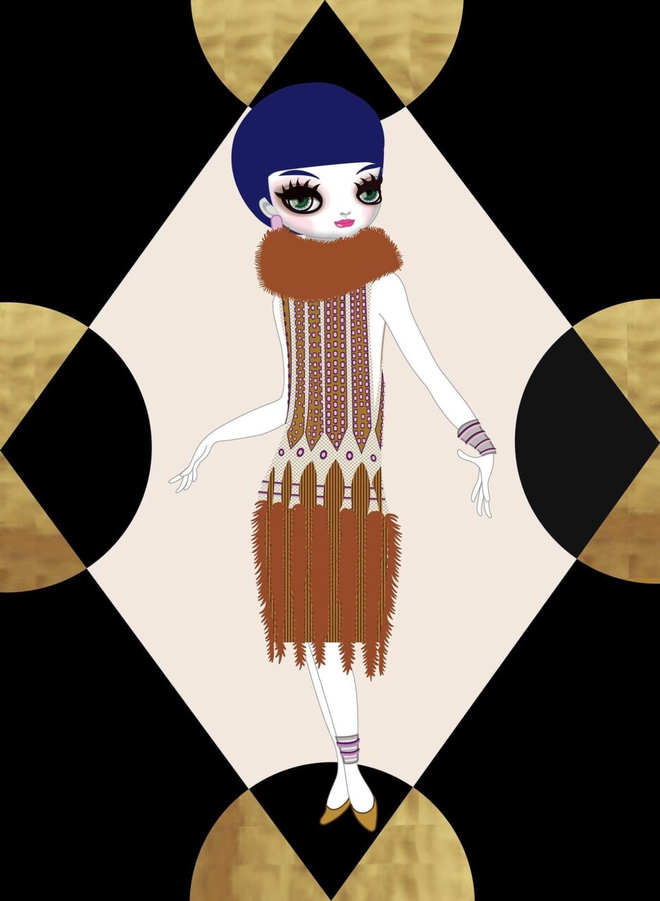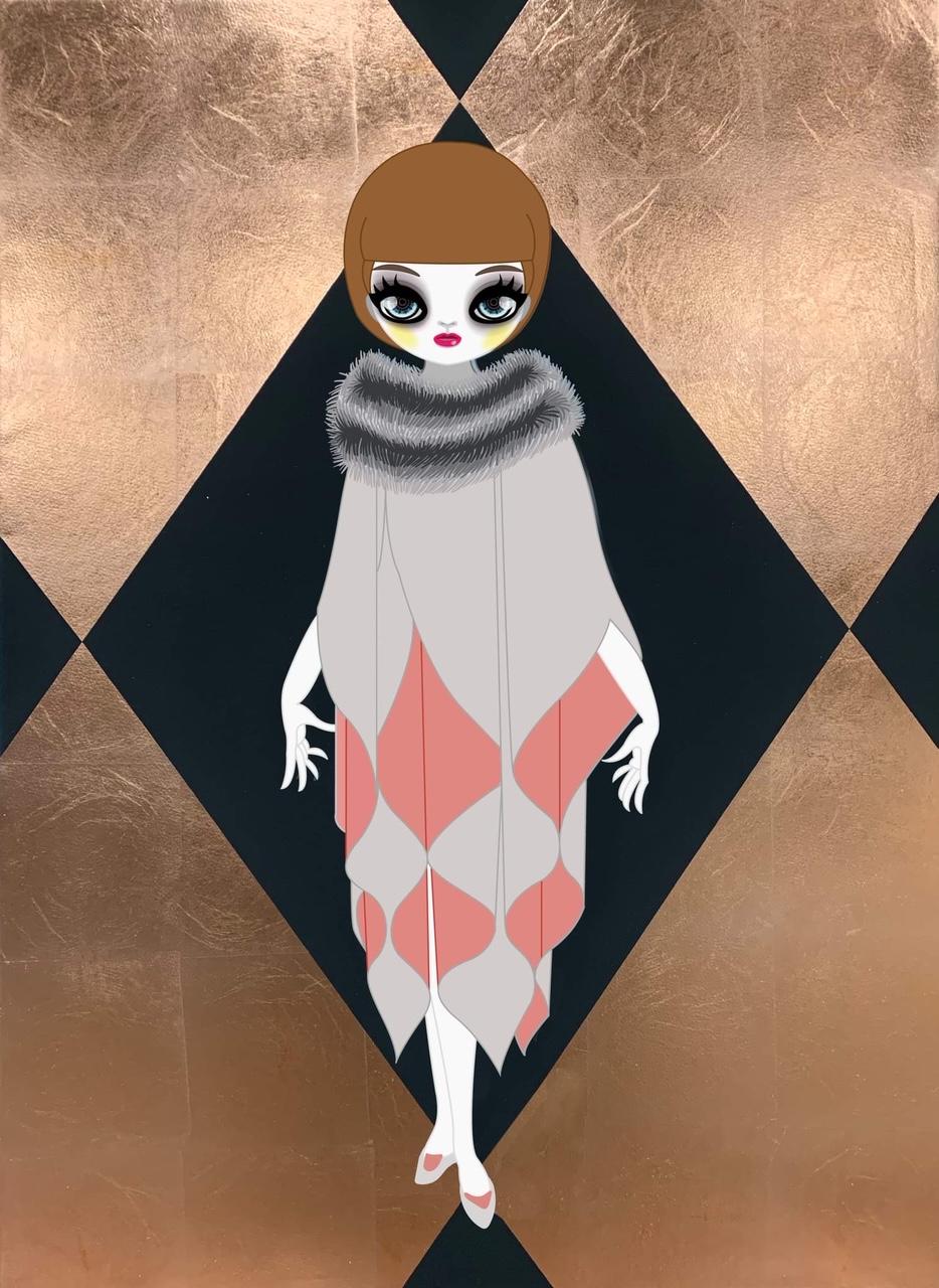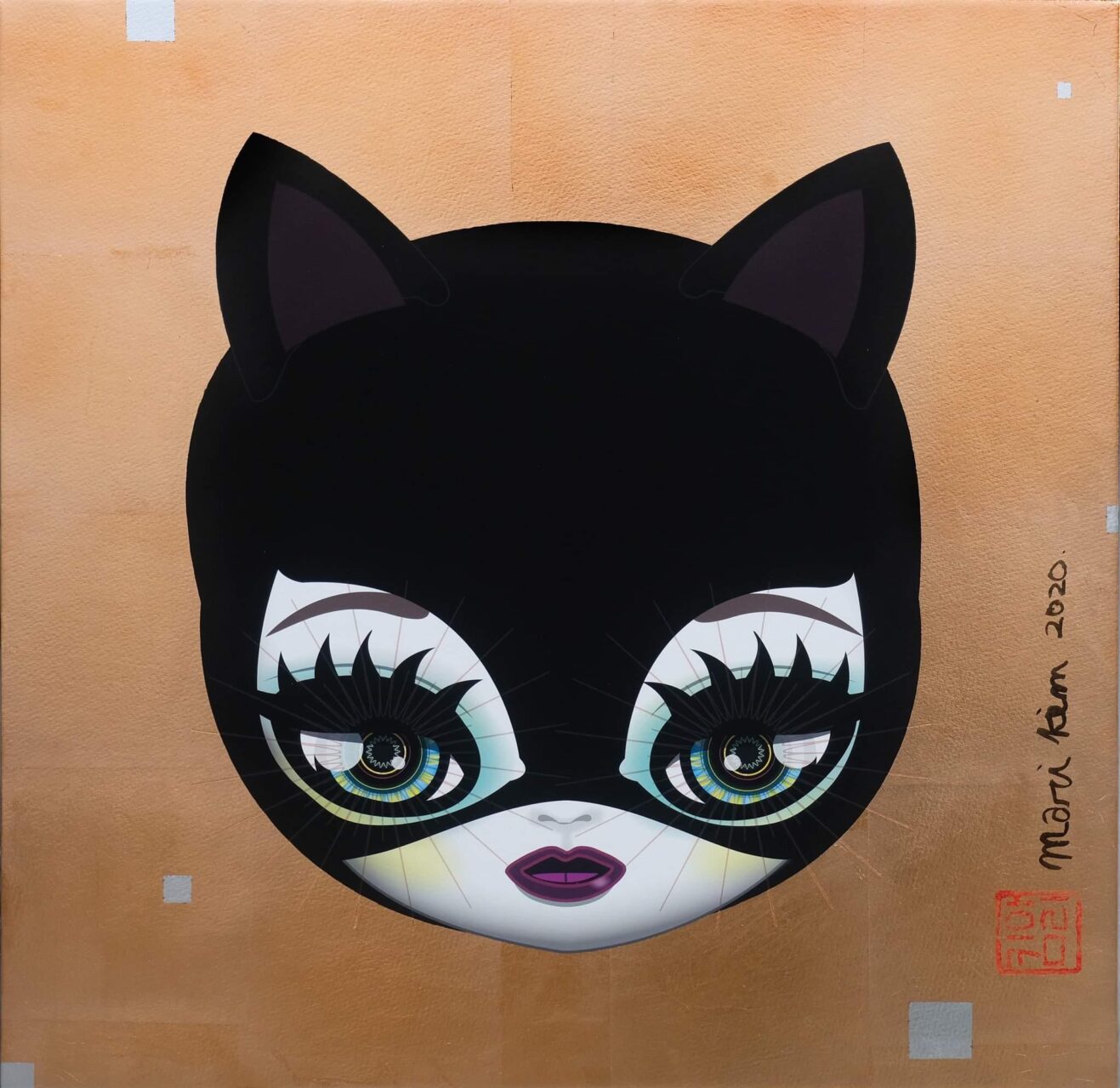 Die Postmoderne ist wie immer eines ihrer Themen, sowie im besonderen der Barock.Mari Kim hat in Japan neue Metallblätter gekauft, so dass sie nicht nur goldene Hintergründe gewählt hat, sondern auch farbige.