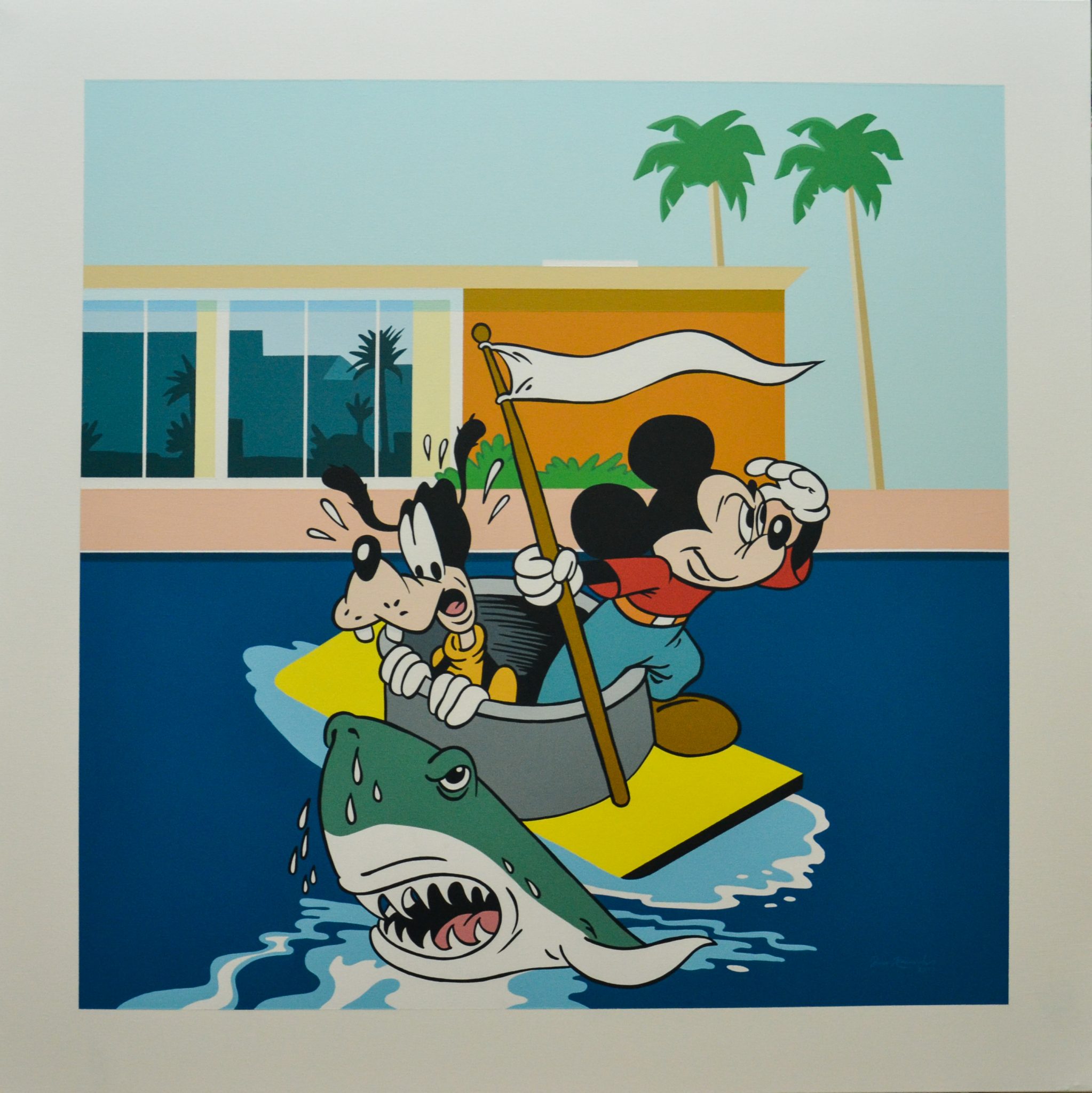 João Noutel’s work is characterized by images of our culture: he works with images of advertising and movie, comic and animatic, consumption and everyday life. He removes them out of their original context, alienates and edits them and assembles them to a complete new whole. In tradition to the Pop art that’s how he makes the trivial and insignificant elements of our culture to the subject of his artwork. His works are both large- and small-sized and are characterized by an intensive color plus a simple and clear use of forms. The individual picture elements are two-dimensional and planar. Here, too, we can tell some similarities to the American art of the 1950s and 1960s.