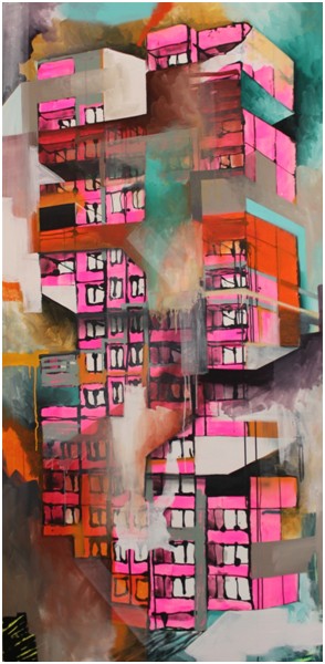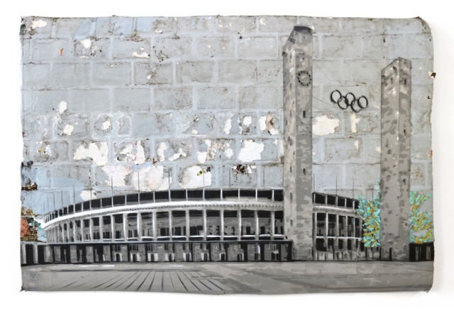 Die Arbeiten des als „Bananensprayer“ bekannten Künstlers sind zum großteil auf Plakatpapieren gestaltet, was ihnen einen unweigerlichen Streetart Charakter verleiht. Die Plakate nämlich, auf denen Baumgärtel seine ikonischen Architekturen gestaltet, sind aus dem Kölner Stadtbild entnommen. Beweis dafür sind die markanten Backsteinabdrücke, die sich auf den Plakatwänden erhalten haben und den Werken eine unvergleichlich authentische Materialität verleihen. Und auch sonst scheut sich der Künstler nicht, das zu bemalen, was die Straße ihm zur Verfügung stellt: Straßenschilder, Aluminiumplatten, Baustoffe.