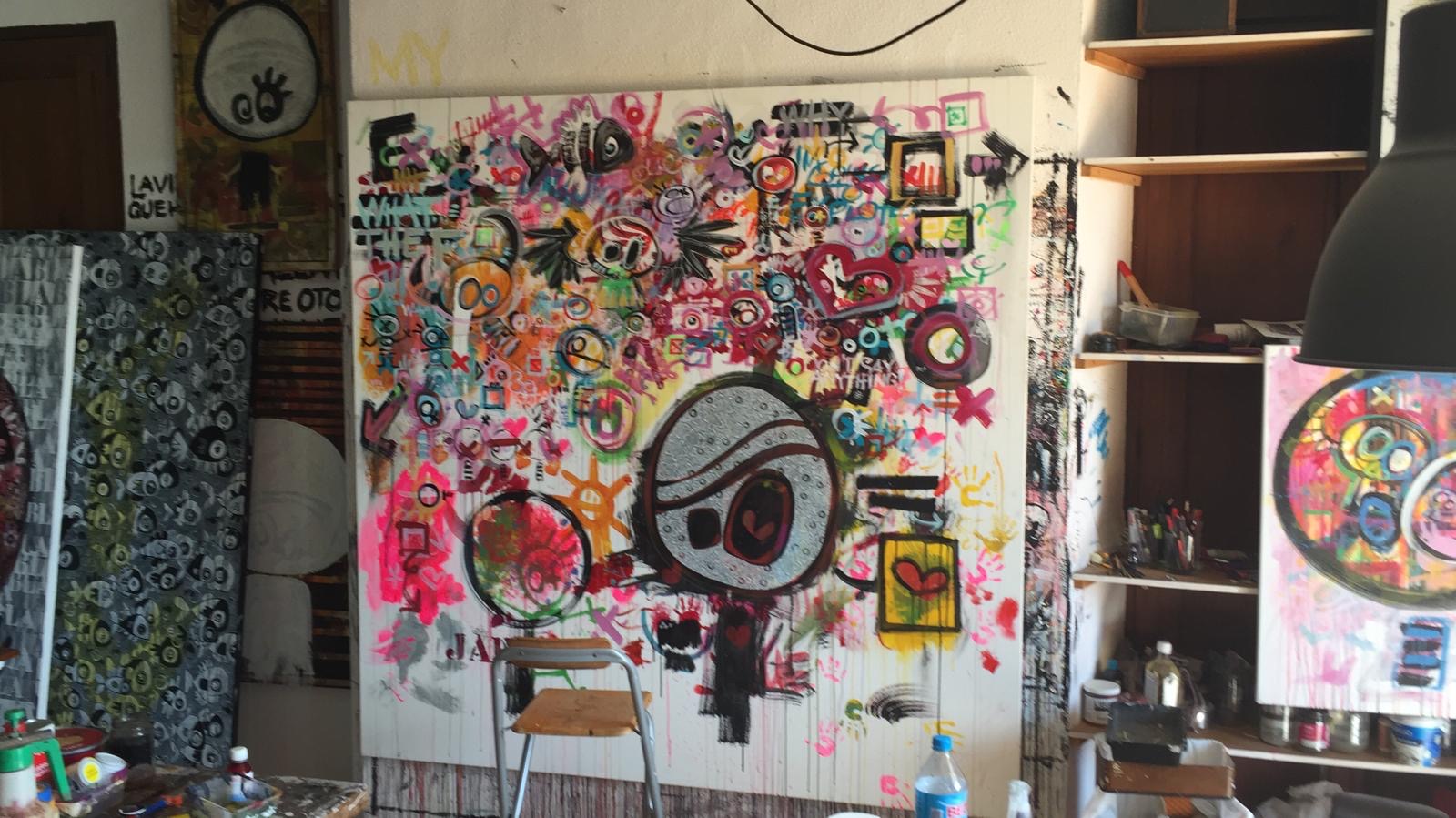 Der Künstler ist zur Ausstellung anwesend und wird eine Wand in der Galerie besprühen.